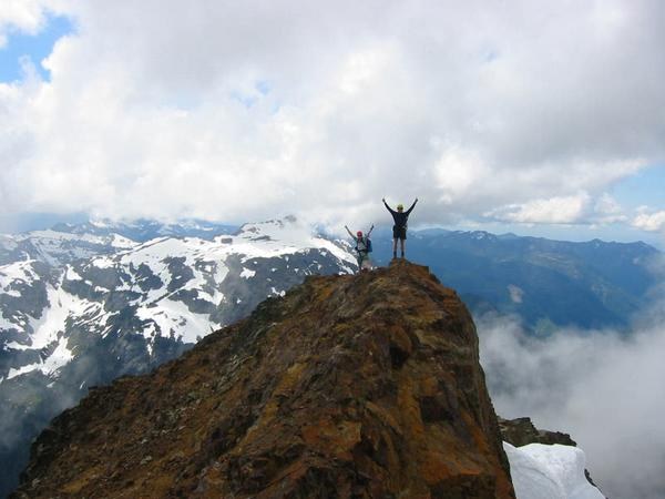 We topped out at 3:00pm and spent a lazy hour admiring the steadily improving views as the clouds dissipated. American Border Peak and Mt. Slesse flirted with us the whole time, never wanting to give more than a partial look. We could not find a register on the summit, which looked like my vision of Mars due to the striking red color in the rocks and dirt.