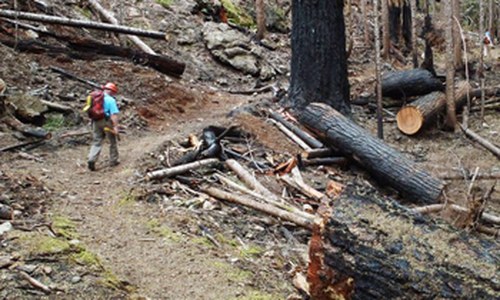 On August 31 last year, an abandoned campfire triggered a wildfire that consumed over 1,300 acres along the Duckabush Trail. The fire began at Five-Mile Camp, burning the steep slopes to the north in a patchy swath between Two-Mile Camp and up and over Big Hump. Over the past few weeks, WTA has put two Backcountry Response Team crews to work on the trail to log out the charred snags and repair the tread.