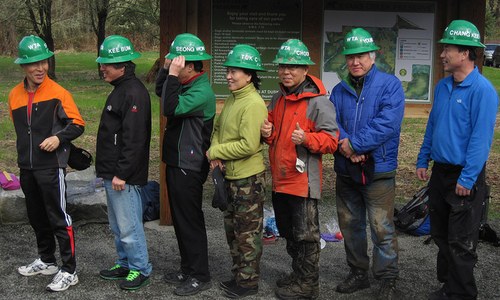 Hard hats off to the Korean Mountaineers! At a recent work party, seven members of the group received their green hard hats, which are given to volunteers upon their fifth day of work with WTA. No one at WTA can remember a time when so many green hats were presented at a single work party.