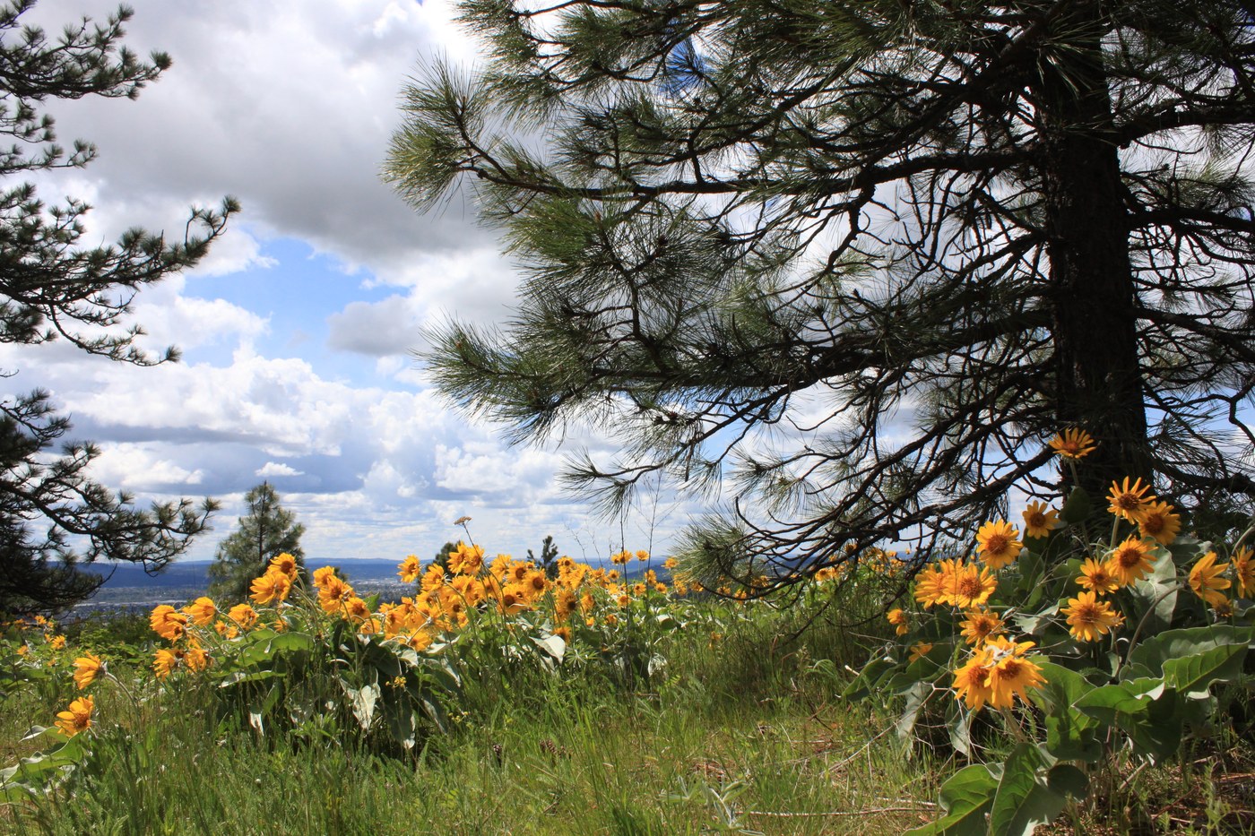 Continue up trail to the first intersection and veer right for the Emerald Necklace loop, for a total of just over five miles round-trip and views of the east Spokane Valley all the way to Liberty Lake. The west side of the mountain is transformed into a sea of gold in the early spring, when arrowleaf balsamroot cover the hillsides on this generally dry side of the mountain. Adjacent to the trail, watch for rocky mountain junipers popping up among the larger Ponderosa pines and fir trees.