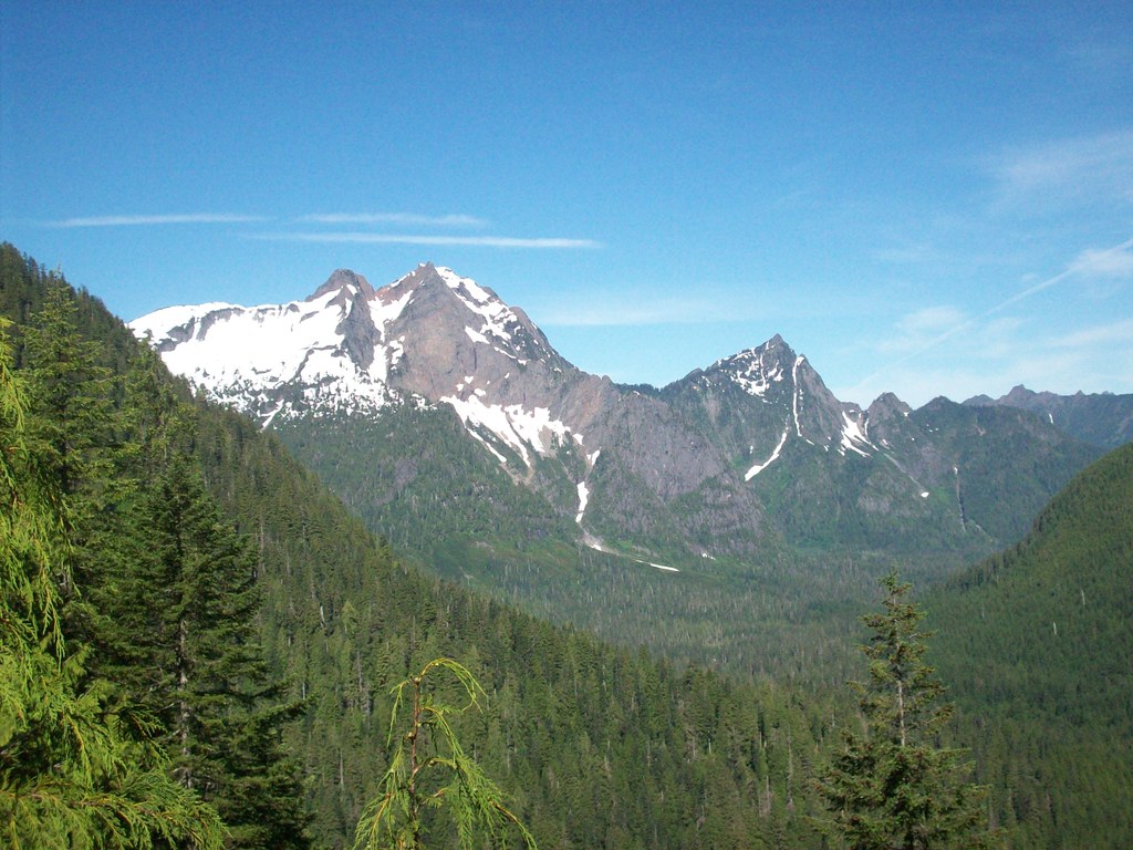 The rocky summit of Barlow Point is soon reached. This point housed a lookout tower from 1935 until 1964 when, ironically, it burned down. Because the surrounding forest had burned in the 1905 fire, the Barlow Point fire lookout had unobstructed views in all directions. The forest has since regrown and some of the views are now blocked by evergreens, but visitors can still enjoy the scenery of both the Stillaguamish and Sauk River valleys along with a number of rocky peaks lining the horizon.