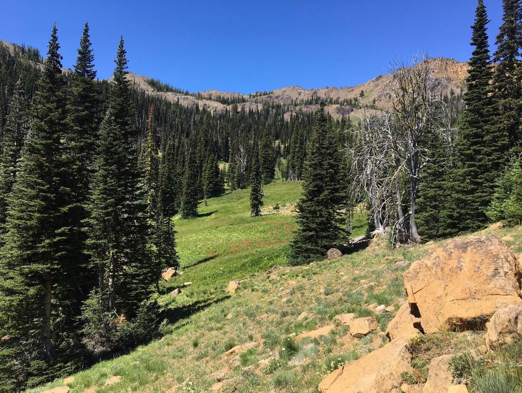 From the start of the meadow, follow the trail straight past an unmarked trail junction for a backcountry campground that is located in a stand of trees. The campground has more than four multi-tent campsites. There are opportunities for water on the west and southwest sides of the campsite, though by late-summer likely only one of the small creek beds has any water. Those looking to fill up may want to do so earlier when the trail crosses Bean Creek at the trail split with the trail that goes to Earl Peak. No formal toilet facilities are available at the campground.