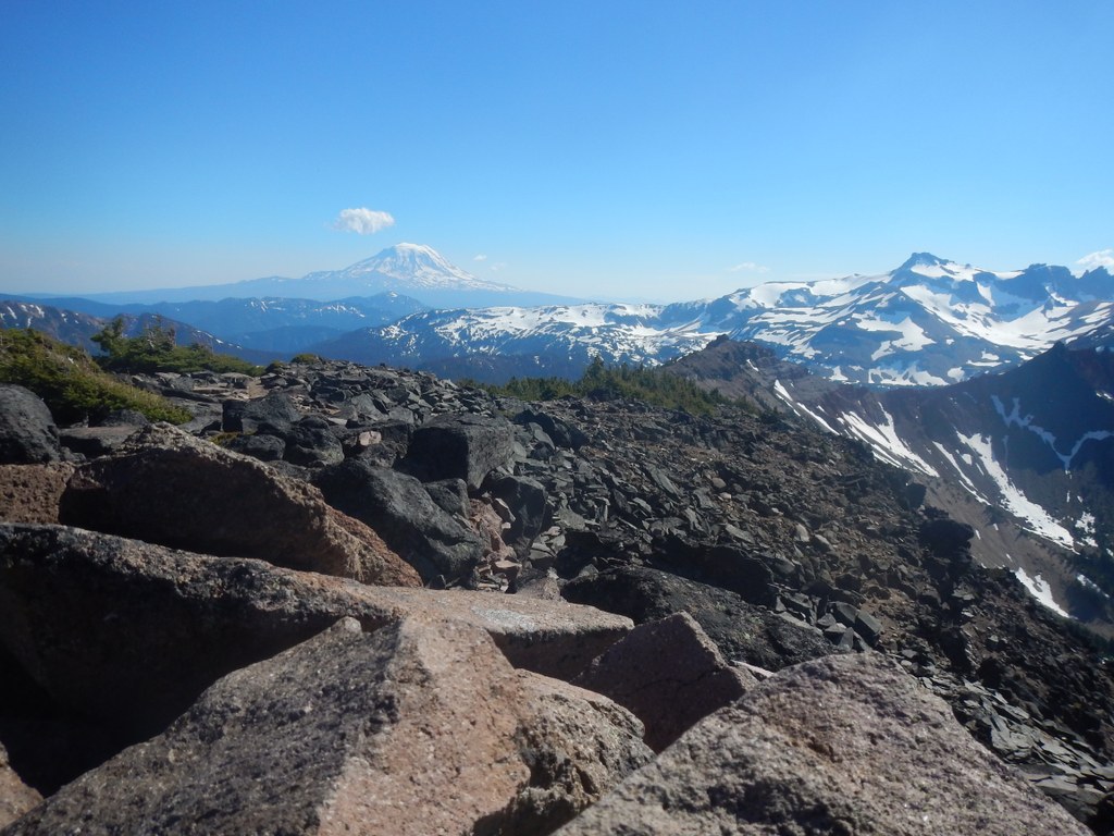 Breaking out onto the shoulder of the summit, take a minute to gasp at Old Snowy, Gilbert and Tieton Peaks, and the McCall Glacier, before following the trail as it leads you to the true summit. While there is nothing left of the lookout that was here until the 1960s, the reason it served as a lookout site is obvious: 360 degree views include Mount Adams, Mount Rainier, and the monumental Goat Rocks, not to mention the countryside to the north and east. See how many peaks, drainages, and lakes you can identify using your map.