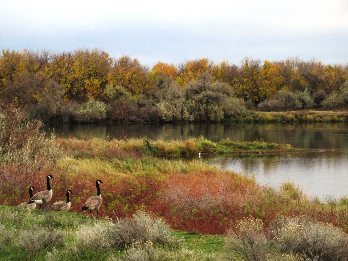 Take a right onto the first trail you come to on the Peninsula at 2.4 miles, cross two roads and stay on the River Trail to return to the system map in the grove of Cottonwoods at 2.9 miles. Head back the way you came close to the river or, after inspecting the map, take a different path along the River Trail or explore the sage brush along the Red Tail Trail.