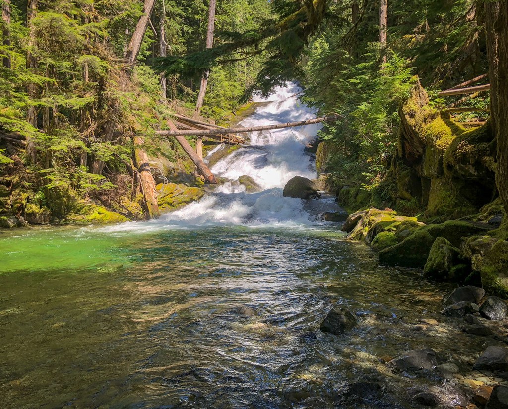 Start from the Carbon River Ranger Station and walk along Carbon River Road. The gain is so gradual that you'll barely notice it. But if the thought of walking eight miles roundtrip is daunting, consider biking! This is the only trail in the park that allows mountain bikes. Either way, you'll find the Chenuis Falls trailhead on the left after 3.5 miles of travel, complete with a picnic table. Facing the river, look left 45 degrees and you'll catch a glimpse of your destination. Continue along the bank until you see a ramp leading down to the river and your first of several footbridges. The Carbon has a habit of knocking these out when the waters rise during heavy rain and snowmelt. Check with the Park Service beforehand to make sure the footbridges are in place. Experienced hikers can get across without them, but it will likely result in soaked boots.