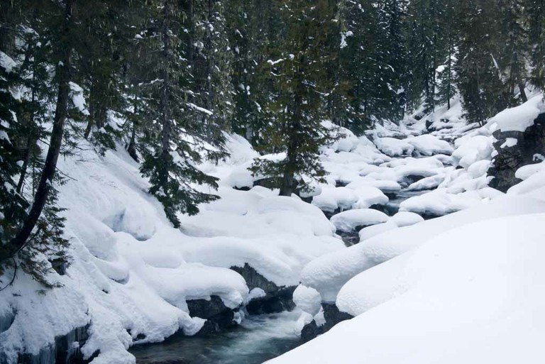 Walk along the the north side of the river through some lovely open forest, typical of what you might find in this part of the state. Note that unlike in summer, snowshoe routes are not always marked, and the footprints of someone who went before you do not always indicate the right way to go. Have a map with you just in case.
