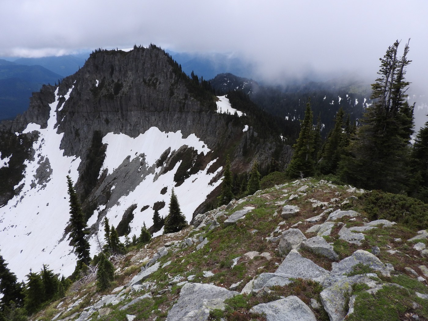 Descend to the saddle and cross a steep grassy slope, cutting back to the right into trees. Look for a steep path that leads up to a flat area below the summit of Copper Mountain.