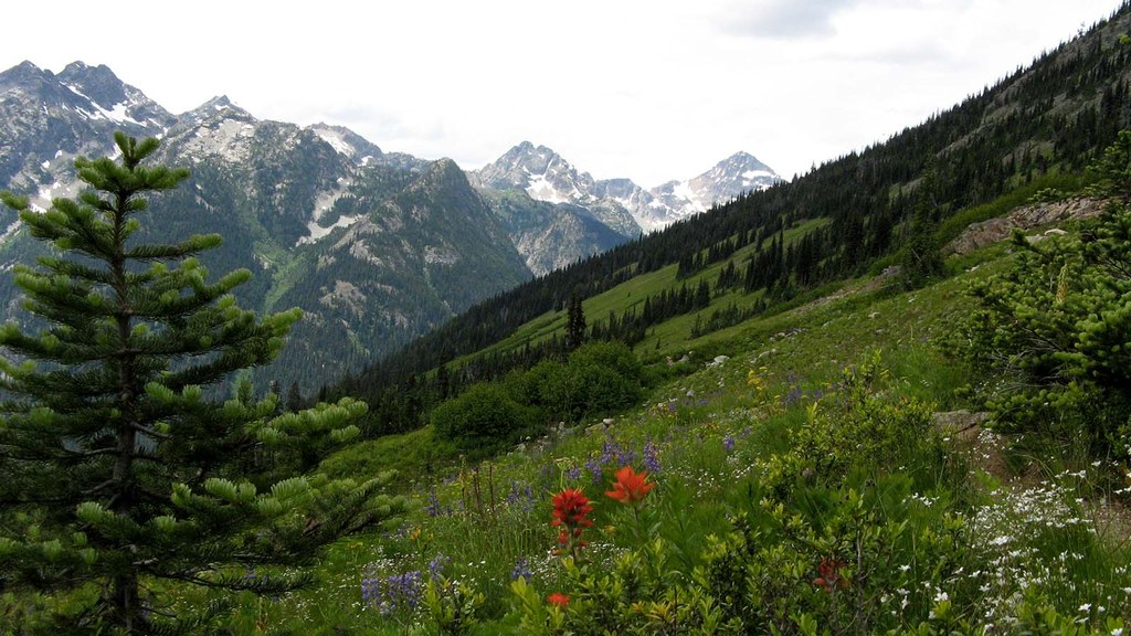 The views to the east, down the North Fork Twisp River, include Lincoln Butte and Crescent Mountain in the Chelan-Sawtooth Wilderness Area. To the west is the Copper Creek Valley and peaks of the North Cascades National Park.
