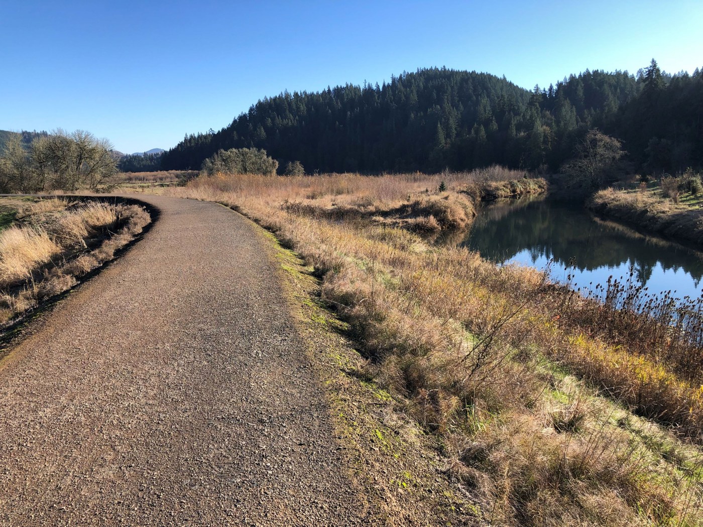 After 1.5 miles, pass under I-5, and pass a Mexican restaurant and a Dairy Queen in quick succession. Now the trail’s character changes. Pass under I-5 again and walk in a narrow strip of land between the freeway and the river. The other side of the river is prime riparian habitat and you might see some ducks. This section of trail also has a west-of-I-5 alternate on a closed dirt road.
