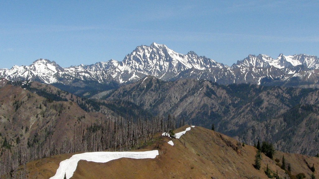The trail enters the surviving forest and makes a climbing traverse for 0.4 mile around the north side of Yellow Hill. This area is the last area to melt out in the spring due to the shade. At the end of the traverse, just before the switchback and descent, is a great view of Elbow Peak and the Stuart Range.