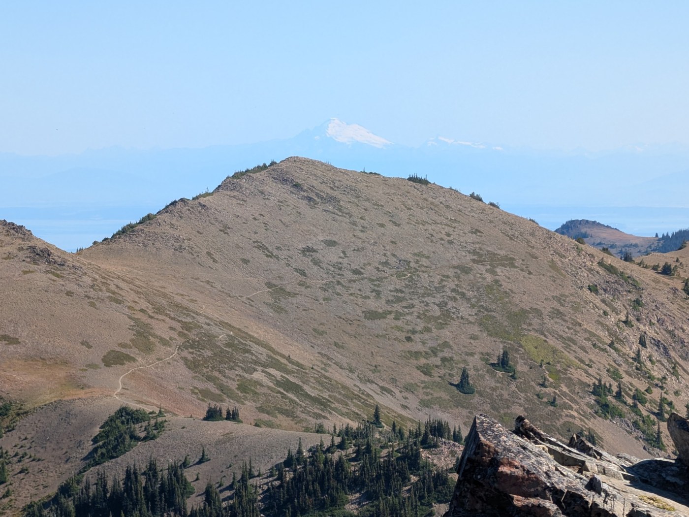 Proceed on this ridge past the trail sign that points to Deer Park. In the summer, marmots are out in plenty, along with chipmunks and ptarmigans. After passing through Roaring Winds camp, descend through a talus field for a bit and then arrive back on good old dirt. You will be able to see Maiden Peak at various points on the trail.