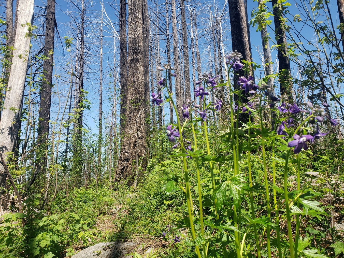At first, the trail is relatively easy to follow, as it winds on a moderate grade towards the ridge itself. Even as it climbs up the ridgeline, the grade is not terribly steep. Yet. Eventually however, the grade does steepen, and the effects of the burn are more evident. Branches and trees litter the trail; this is not a trail to be on in high wind.