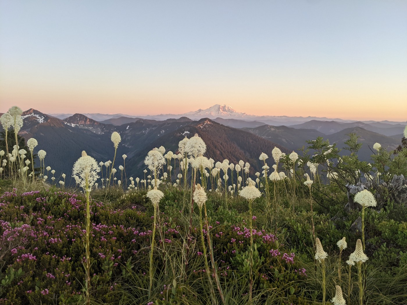 The trail progresses north, with the lookout on your left. Leave the fields of huckleberries and follow the narrow, rocky trail through the bottom of a basin. Enjoy the easiest part of this hike, a jaunt through a green alpine meadow bordered by a talus slope to the south. The final push is a grunt, but the views! Break out above treeline onto a talus field, and marvel at the lookout perched on the rocks. Further afield, Mount Stuart and the Teanaway are visible to the east, Rainier commands your view to the south, and if it's a clear day, you can make out Baker floating on the northern horizon.