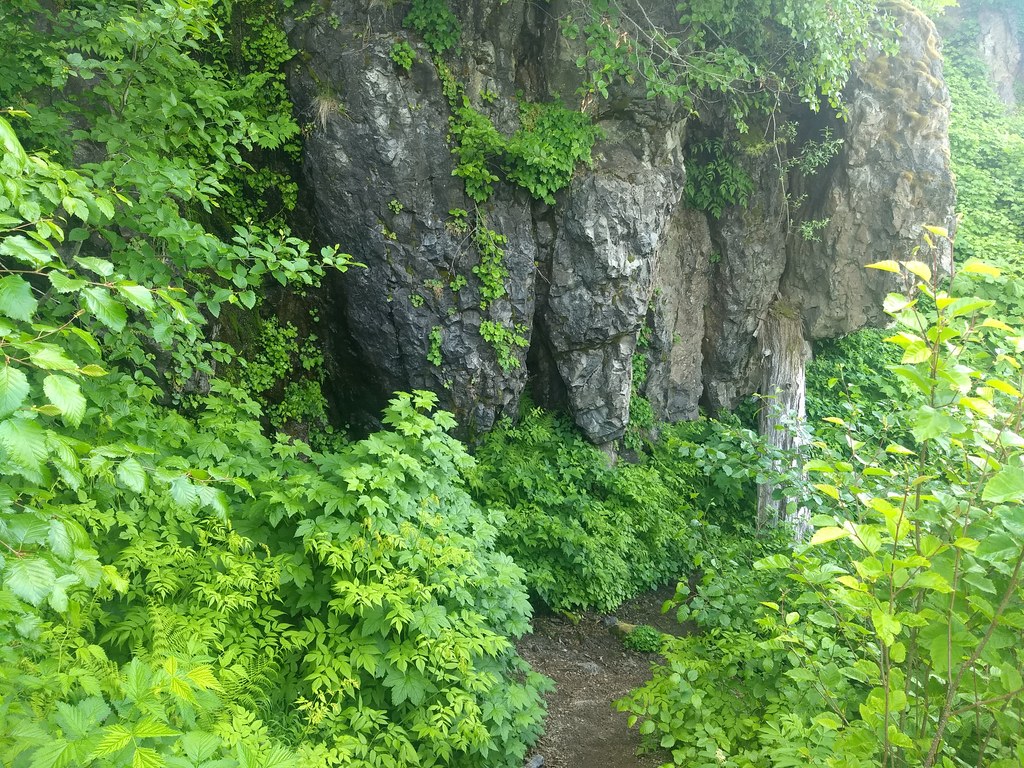 From the parking area, head around the low stone wall and follow the trail left, down the hill. (Ignore the washed out section to the right). Head straight into a green tunnel of alder, maple and ferns, kept for the most part away from the trail. But occasionally they do brush passing hikers on the head and shoulders.