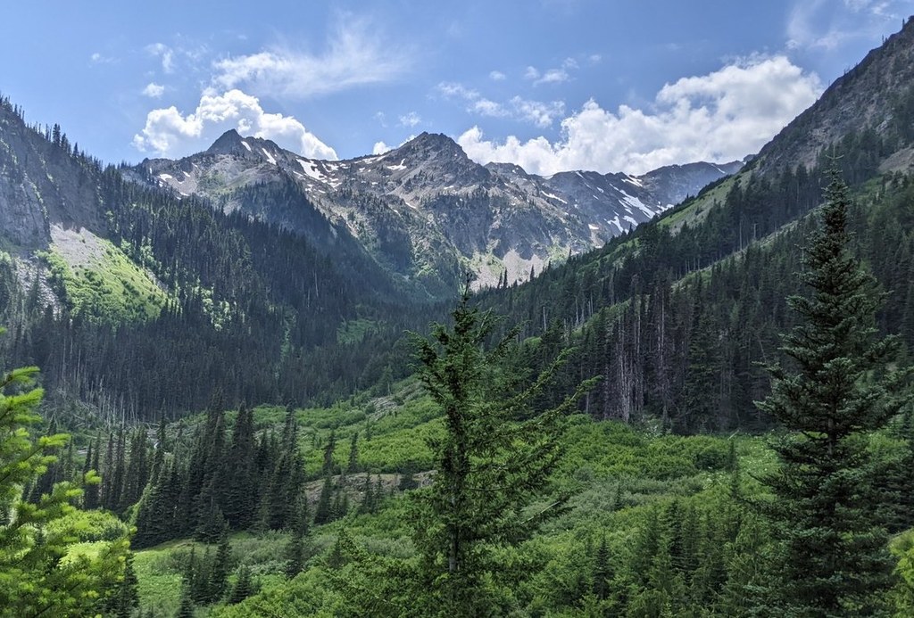 Then suddenly, you’re at the park boundary. The trail ends here, though there is one more camp just inside the park—downhill and to your left from the boundary sign. To your right is a short bootpath to a nice overlook of Mount Mystery to your right and Little Mystery straight ahead.