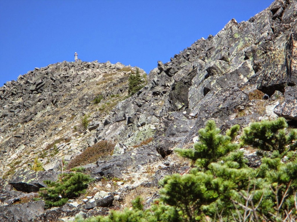 Choose a path up the west slope, eventually following the southwest ridge to the summit. You may find it easiest to look for animal trails to follow, but the west side has no cliffs so many different routes will work. At the summit the views are huge, including Jack Mountain, Silverstar, Bonanza, Glacier peak, Goode Mountain, McAlester, McGregor, Dome, Black.... The cliff on the north side is almost too scary to look over.