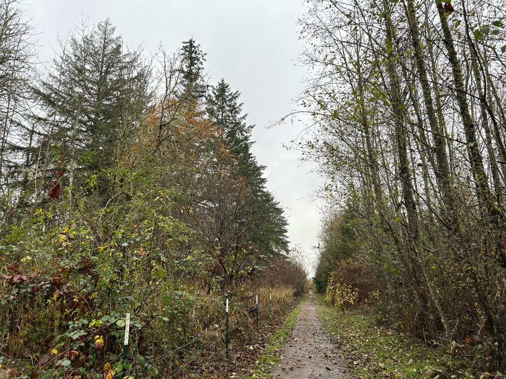 The forested trail follows the park boundary west before turning right (north) — take care along these sections as some of the boundary is marked with barbed wire fencing that can be near the trail. You’ll then turn right again (east) and start to see the disc golf course through the trees as you continue to follow the park boundary.