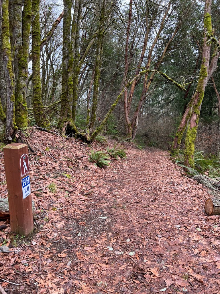 This wide trail offers gentle rolling terrain as you travel through a forest of tall trees and undergrowth. Find a variety of deciduous, evergreen, and Madrona trees along this trail. Watch for thick bright moss, stumps, nurse logs, salal, ferns, Oregon grape, holly and other plants along the way.