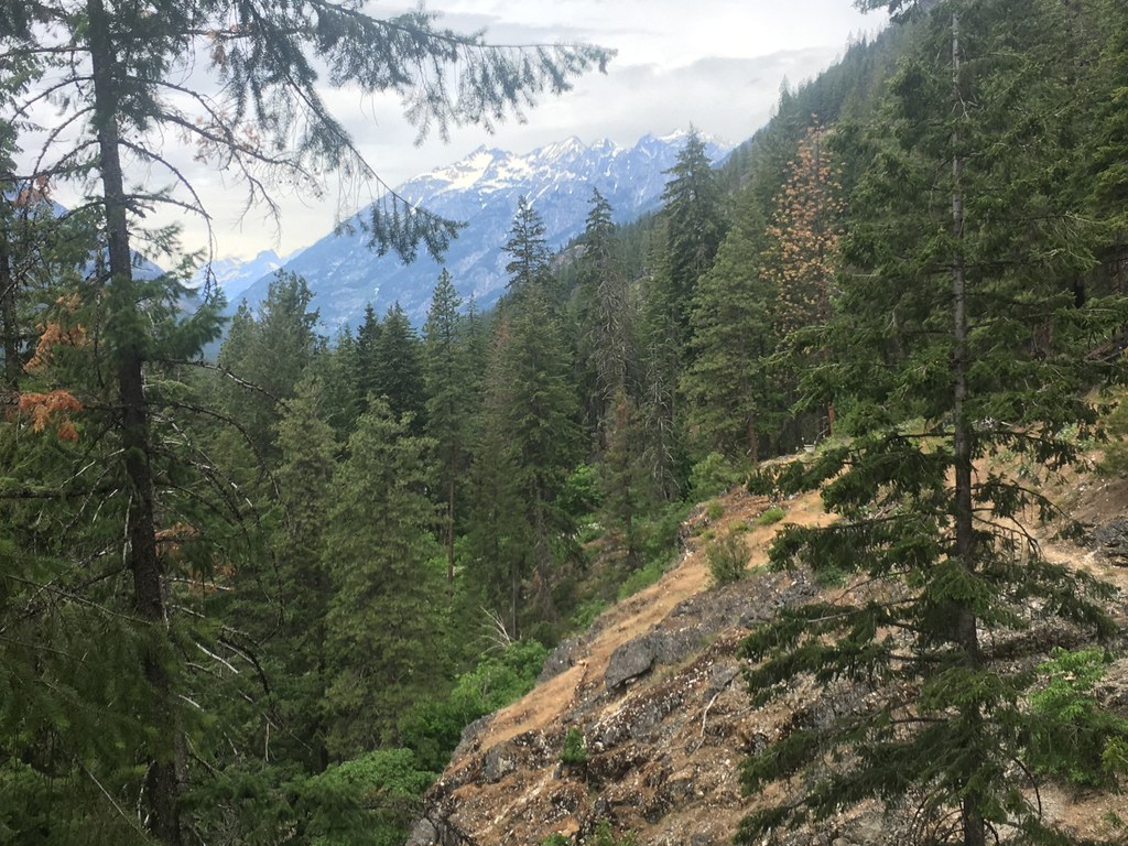 Continue past the junction as the trail follows the contoured slope decorated with Cascade Oregon Grape and sword ferns gently down to a viewpoint on a rock outcropping in .2 miles. A perfect wooden bench is placed to take in the surrounding summits of Castle Rock and Tupshin Peak to the left and MacGregor and Rainbow Mountain to your right. From this vantage point it is easy to see why this valley was named Stehekin, meaning “the way through”, by the indigenous people who used Lake Chelan to travel south from Cascade Pass.