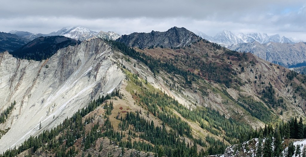 That trail climbs again almost immediately on a rocky path for another 0.7 miles (contrary to the sign at the junction). Here a very faint trail comes in from the left. Unsigned, this trail junction is with Jolly Creek, whose trailhead is off the North Fork Teanaway River Road. It’s from here, not from the W Fork Teanaway Trail junction, that it’s one mile to the summit of Jolly Mountain, and you have a short traverse before the switchbacks begin in earnest.