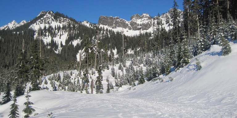Since the trailhead is about an hour from Seattle, the grade is gentle and the views superb, this is a popular destination. The route is relatively easy to follow because it follows an closed forest road. Experienced snowshoers who are good at route finding may go off the road and find their own routes to the lakes, but be aware of avalanche danger.