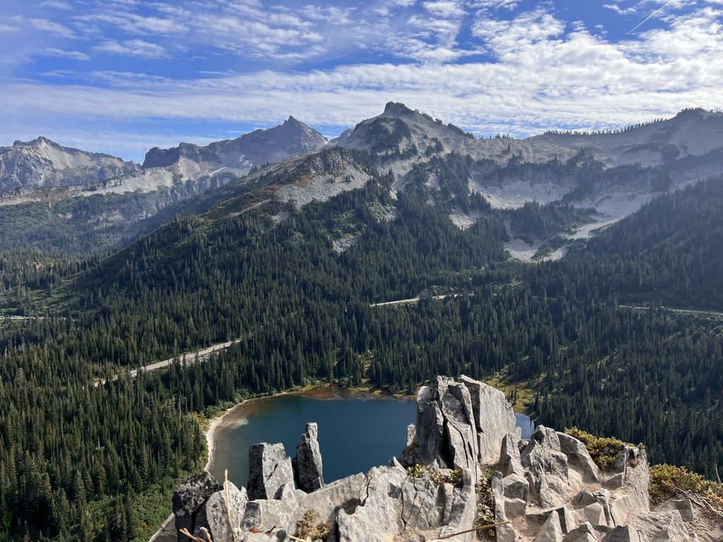 Hiking along the road, you'll be on the shore of Reflection Lakes for half a mile before turning sharply away from the road and beginning a mile-long climb through forest and across creeks to Faraway Rock. Note that just after leaving the road, a junction with the Wonderland Trail peels off to your right. Proceed straight to stay on the Lakes Trail. Faraway Rock offers an overlook for the lake just before you arrive at a junction with the west end of the High Lakes Trail.