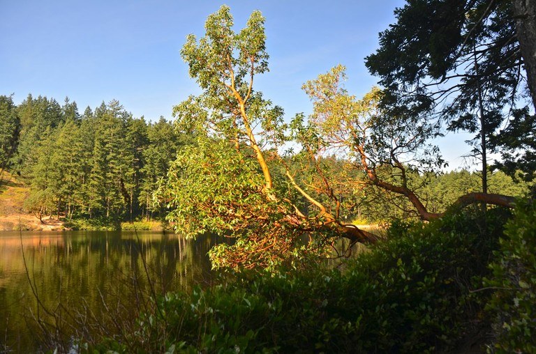 Once over the bridge, the trail becomes slightly more rugged, dipping very near the lake at points and becoming more brushy than it has been so far. Hike along Trail 132 and then bear right onto Trail 101, which stays close to the west side of the lake. The quality of trail improves as you near the north end of the lake. Picnic opportunities abound here, with slabs of rock and moss providing good places to rest, recline and take in the views under bright madrone trees. After hiking a little more than a half-mile, find yourself back at the parking lot, and your car.