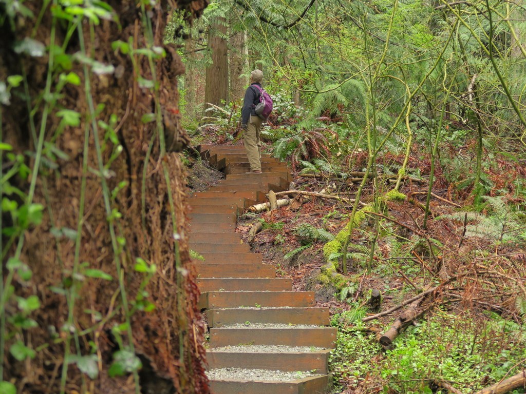 The Darvill trail had long been used by locals to access Little Mountain but with this recent acquisition WTA volunteers have been busy since then helping to improve it from a footpath to a sustainable trail. The trail starts out next to the gravel driveway and begins a gradual uphill through a swampy area with lots of skunk cabbage, beautiful when in bloom. Here you can see the hard work done by volunteers as you hike over the boardwalk and up some well-built stairs.