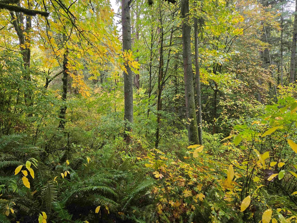The forest features mature maples, alders, Douglas-firs, and an occasional western red cedar. There are also abundant Indian plum, snowberry, red huckleberry, sword and bracken ferns. It’s a colorful show in the fall.