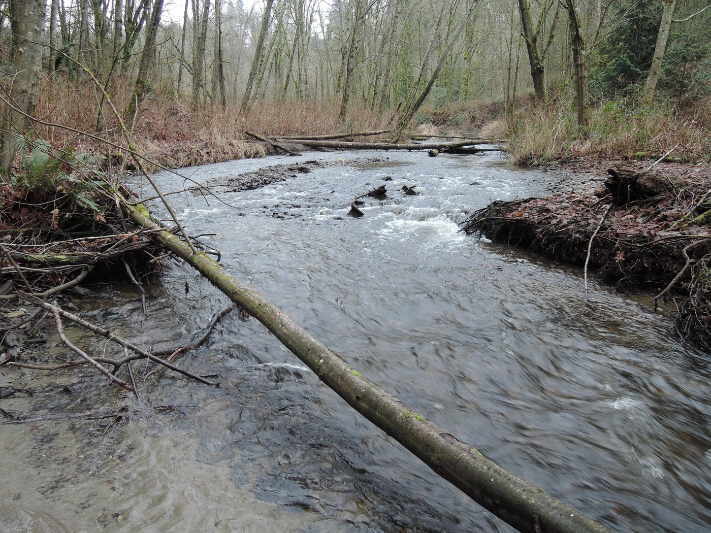 The May Creek Trail continues heading east along the edge of the valley, the soft rush of mighty May Creek coming up from below. May Creek is the third largest tributary of Lake Washington, and can have an impressive flow of water in winter. After 0.8 miles from its start, the trail arrives at Sylvan Creek's small ravine, which it crosses on a fill. Just beyond the creek is a house with a horse paddock; the trail passes to the right of the house, then reenters forest.