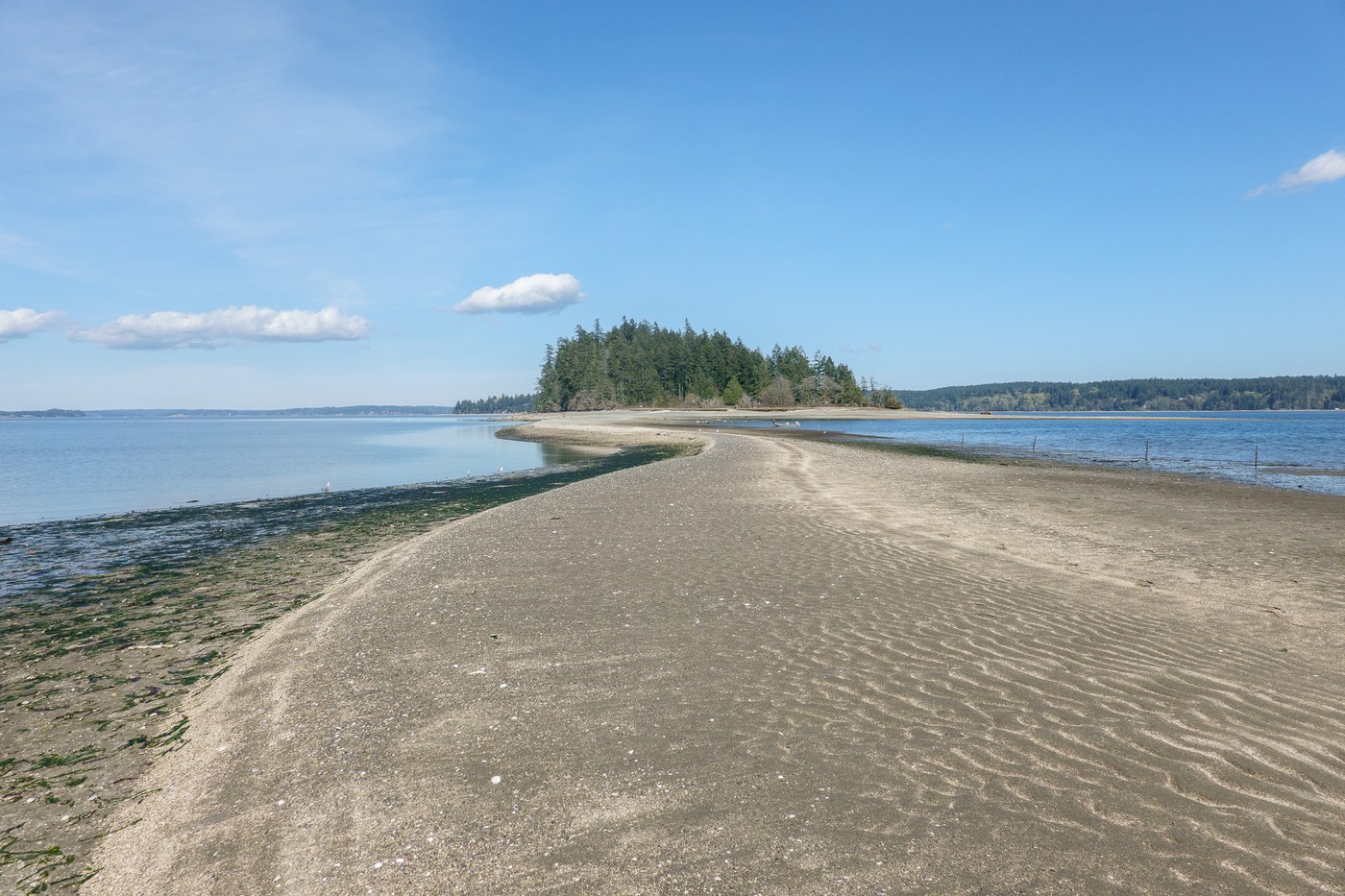 Start at Harstine Island State Park, and head down to the beach on the forested Beach Loop Trail. Hike south on the beach for a little over a mile to see McMicken Island and the raised tombolo to your left when the tide is low. Be careful to study tide charts before heading over so you don't get stuck on the island at high tide!