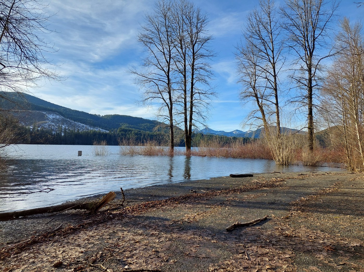 Spared from the axe, visitors will see old-growth Douglas Fir and Western redcedar. The lake was formed by the Mount St. Helens ‘Cave Basalt Flow’ 1700 years ago which blocked part of the Kalama River. The Department of Natural Resources maintains the trail.
