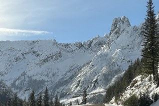 Stunted hemlocks punctuate the lush green meadows, and brightly colored wildflowers, like glacier lilies and pink heather, bloom in season. In less than a half mile, crest a ridge and take in the expansive mountain views. 500 feet below and 0.7 mile away, sits sparkling Monogram Lake at the base of jagged Little Devil Peak.