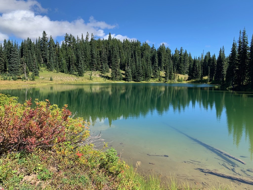 From the view point, the trail continues along a slight downhill grade of loose rock and dirt and ash with exposed roots and becomes more open. A quarter mile from the viewpoint, the trail has been rerouted. The old trail is to the right and the new trail is now well worn to your left going uphill. About half mile later, you will arrive at a small pond surrounded by trees and grasses. Continue over rolling hills and along Nannie Ridge and enjoy the surrounding mountain views, tall trees and wildflowers to Sheep Lake.