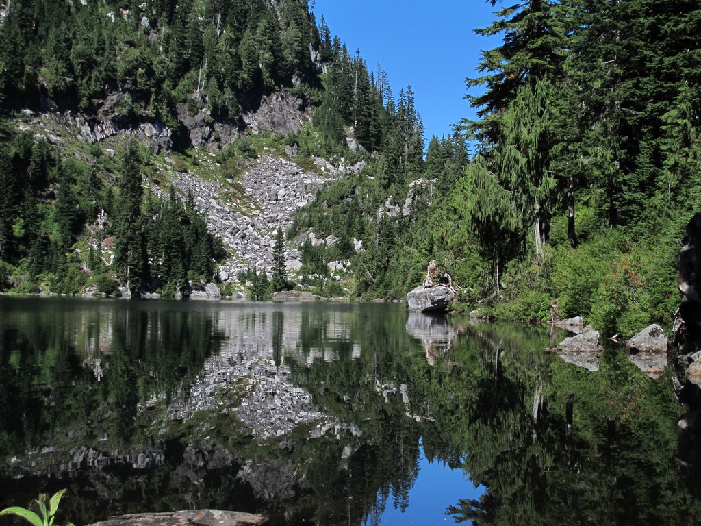 A short, but rough hike to two small lakes on the eastern slope of Mount Pilchuck. The first, Bear Lake is under a half mile from the trailhead on a good trail. Once on the way to Pinnacle, however, the trail changes to a rocky, rooty, muddy mess, slow going up, and slow coming down. The reward for putting up with this mess of a trail, is a nice quiet little lake ringed by rocks and trees, usually not crowded, even on a sunny Saturday.