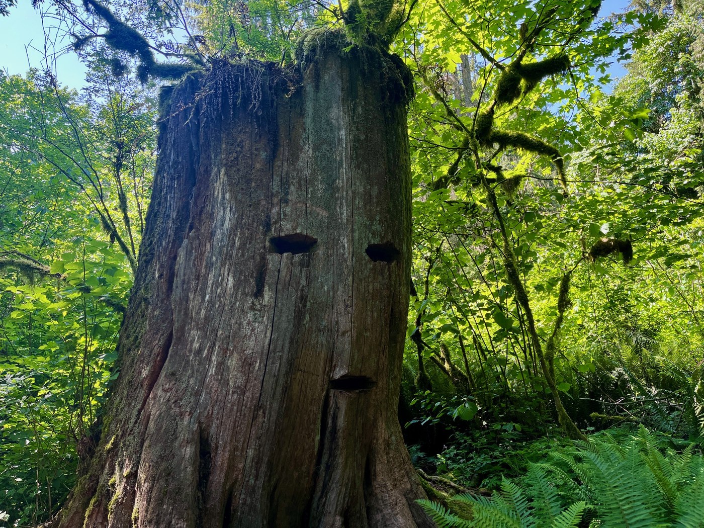 Continue walking the trail until about 0.2 mile, where you’ll hear the sounds of Friday Creek and find yourself greeted by a large cedar stump with what looks like a face carved into it, a remnant of the logging history that defined this region in the past. On the right is a raised wooden bridge crossing over to the creek itself. In the spring and summer, one can hop along rocks to reach the water itself or look for red-legged frogs and Pacific chorus frogs along the banks, while in the fall and early winter, the creek is full of spawning salmon making their way through the Samish watershed.