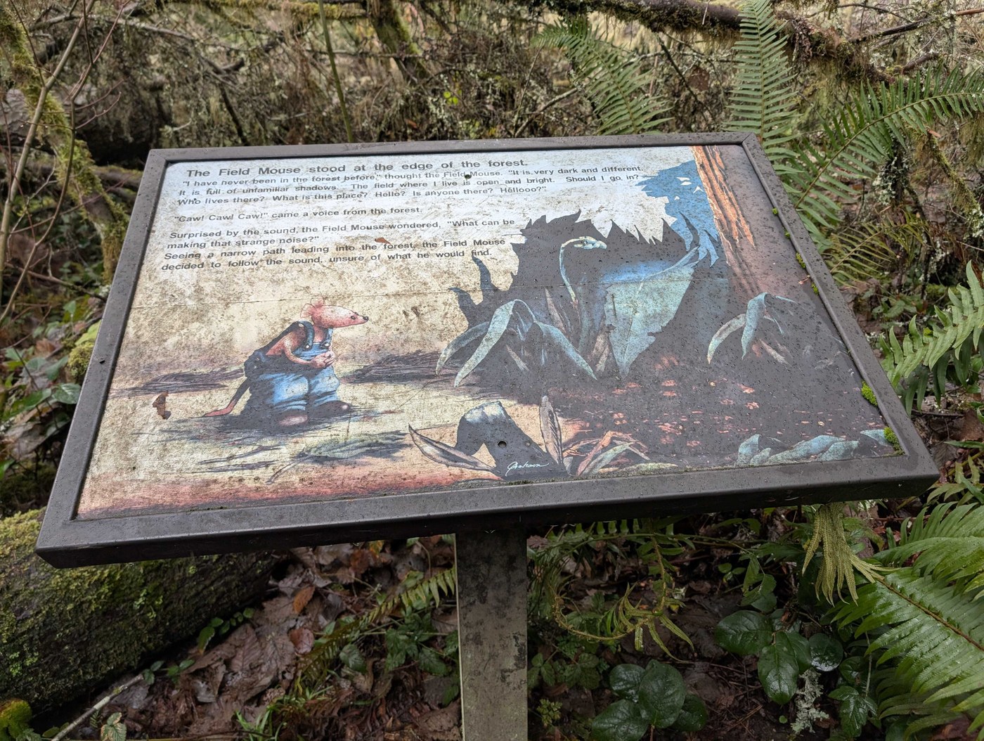 Follow the trail to the right with the first story board. The boards are usually not within sight of each other but come into view after a few steps from the last board. First, meet Field Mouse who decides to go on an adventure from the sunny meadow to the dark woods. Then, meet the various animals in the woods as they explain their jobs: The crow picks up garbage; termites and bugs transform a tree into a nurse log; etc. Sadly, the bomb cyclone in late 2024 felled the eponymous Pretzel Tree.