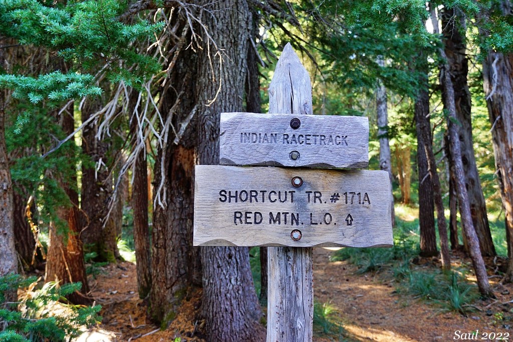 Starting from the Crest Camp trailhead at Forest Road 60, hike north on the Pacific Crest Trail for about 3 miles, gaining some 700 feet to the junction with the Shortcut Trail. Hike the Shortcut Trail to the Indian Racetrack and the junction with the Indian Racetrack Trail.