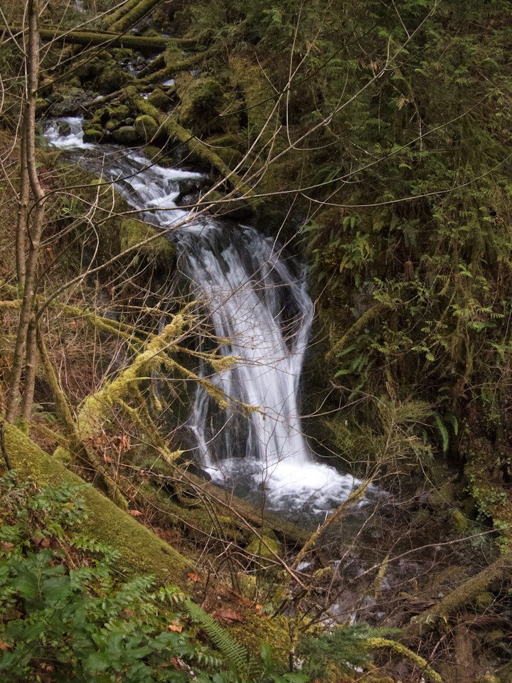 Tree branches obstruct hiker's view of a nice waterfall on Elbo Creek, but views on trail are typical of the Peninsula - lush greenery and rushing creeks abound. This trail is particularly nice in the autumn, since most of the trees lining the trail are deciduous, offering a beautiful display of color in the fall.