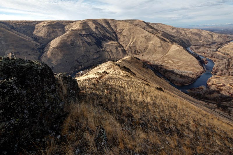 This short, steep and fairly rough hike climbs up a ridge crest on the north end of the Yakima Canyon, ending at a 2,646 foot summit marked by a tall wooden pole (and a summit register within an ammo box). The ascent offers fantastic views all around, particularly north up into the farmlands at the north end of the Canyon, and south down the serpentine Yakima Canyon. Notice the entire Stuart Range to the north and Mount Rainier peaking over the horizon to the west.
