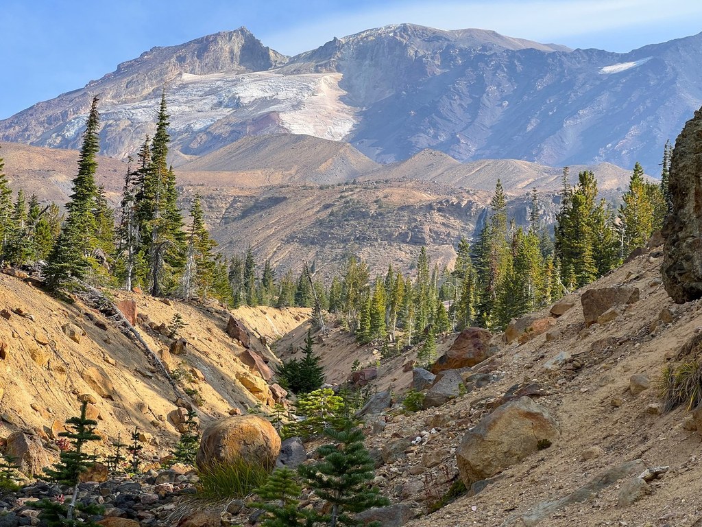 Pass again straight through this junction as your way continues on for another 2.8 miles to the junction with the South Climb trail, one of the more popular routes up Mount Adams. Past the junction with South Climb trail, the Round the Mountain trail follows the wilderness boundary ane the north end of the Aiken Lava Bed.
