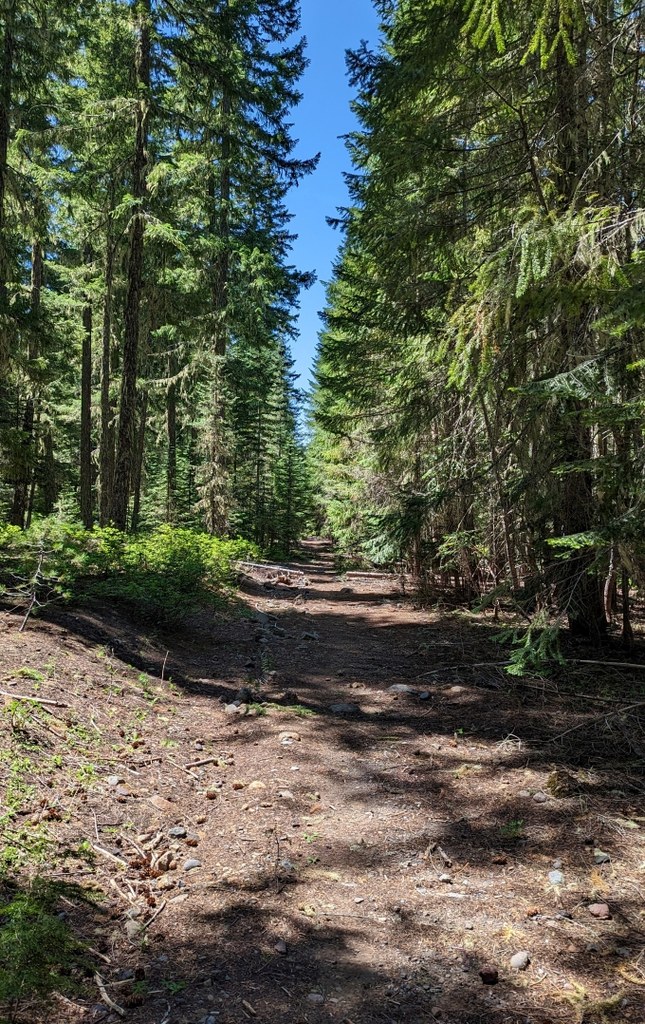 This trail follows a gentle grade through open forest, some of which is an old burn scar. Huckleberry bushes can be found along the trail, along with a couple of peekaboo views of a grassy meadow and Mount Adams.