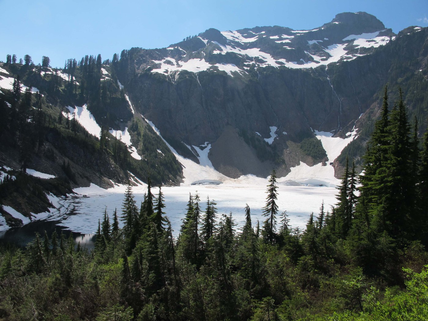 Just past the turnoff for the campsite, continue up the road and cross the Sauk River on a footbridge and enter the town site. Cross the big clearing by the railroad turntable and find the trail to Poodle Dog Pass and Silver Lake and Twin Lakes on the other side. After almost 2 miles of steady switchbacks on steep, rocky trail, reach Poodle Dog Pass.