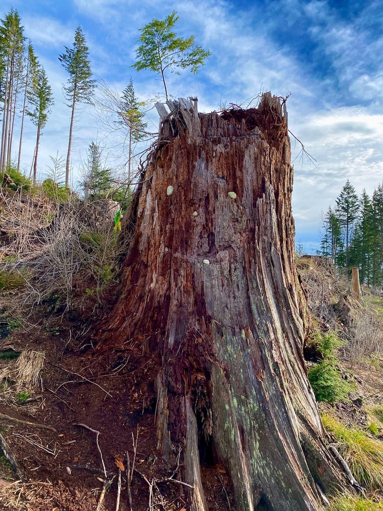 Continue following the trail and you will see a trail sign on your right just after a sharp left turn. This is the start of the South Tiger Summit Trail. In about 0.1 miles, be alert for a large stump on the right — known for its signature "smile" — a remnant from logging a century ago.