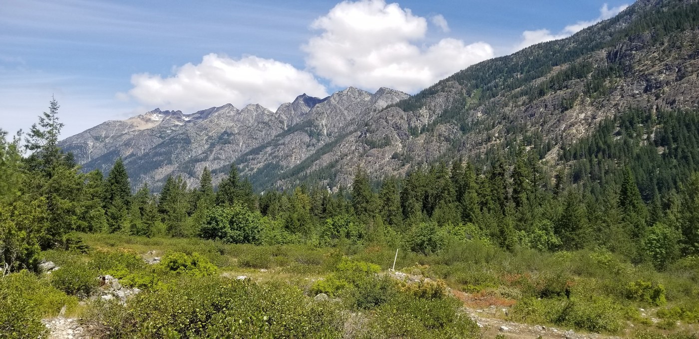 For about a mile, the trail meanders at the base of the mountains on the west side of the valley, crossing Blackberry Creek and a few other streams that feed the Stehekin River, before the river itself really comes into view.