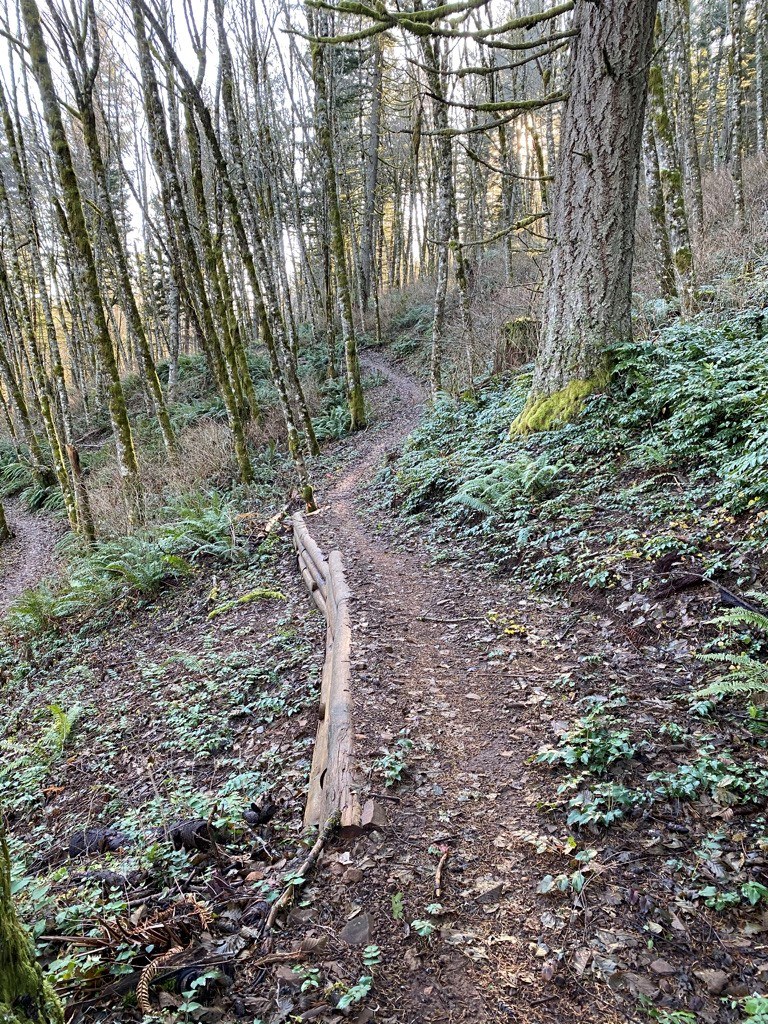 The path is through a third-growth Douglas and hemlock fir forest planted in the 1960s. There are no streams, (so bring all the water you need), a closed canopy (shade!), and the understory is sparse with namesake ferns and Oregon grape.