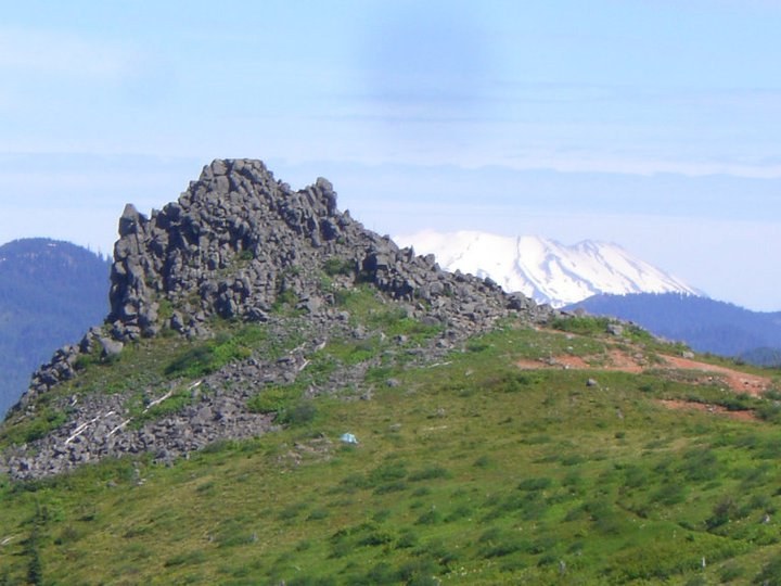 Walk up the spur jeep road to the base of Three Corner Rock. Concrete steps lead to within 12 feet of the top. Scramble the rest of the way to the flattened top where a lookout tower formerly stood. Enjoy 360 degree views that include Mounts Hood and Jefferson to the south, Mount St Helens and Mount Rainier to the north, Mount Adams to the northeast, and the Columbia River glinting to the southeast and southwest. Other notable high points include Silver Star, the highlands of Indian Heaven Wilderness, and the Columbia River Gorge sentinel peaks of Dog Mountain on the Washington side and Mount Defiance on the Oregon side.