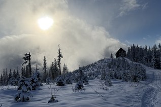 Your ongoing main graveled trail bends around toward the south and soon meets up with the Bus Trail. The namesake bus, such as it is, lies on its side just a few feet to your left. There's not much to see, but you might as well take a quick look. Old buses, suitably altered, sometimes were used by loggers as kitchens and bunkhouses, and that may be what brought this one here to end its days—and contribute a trail name—in the Tigers.