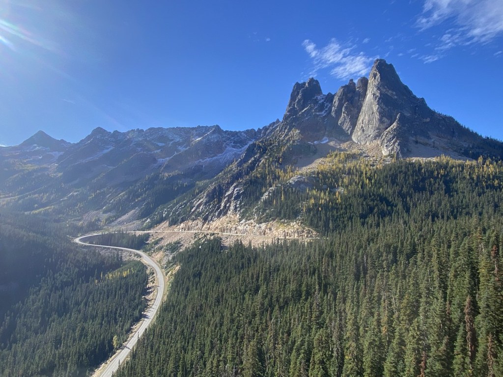 The namesake’s east face rises a sheer 2,000 feet above sinuous Highway 20 below. Ranges of jagged ridgelines fall away in succession — Vasiliki Ridge, Snagtooth Ridge, Kangaroo Ridge — it is a veritable alpinist’s wonderland for the low admission price of pulling off the highway. In season, your views of golden larches spread across the apron of Liberty Bell will be the easiest-won autumn colors you’ll ever see.