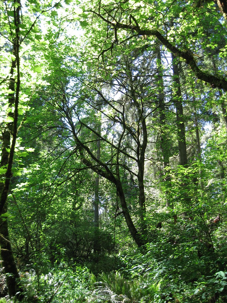 The entire park offers many large conifers, apparently genuine old-growth as there is no sign of the large stumps seen in other areas that have been logged, such as at Tiger Mountain. Large deciduous trees also are present in Weowna Park.